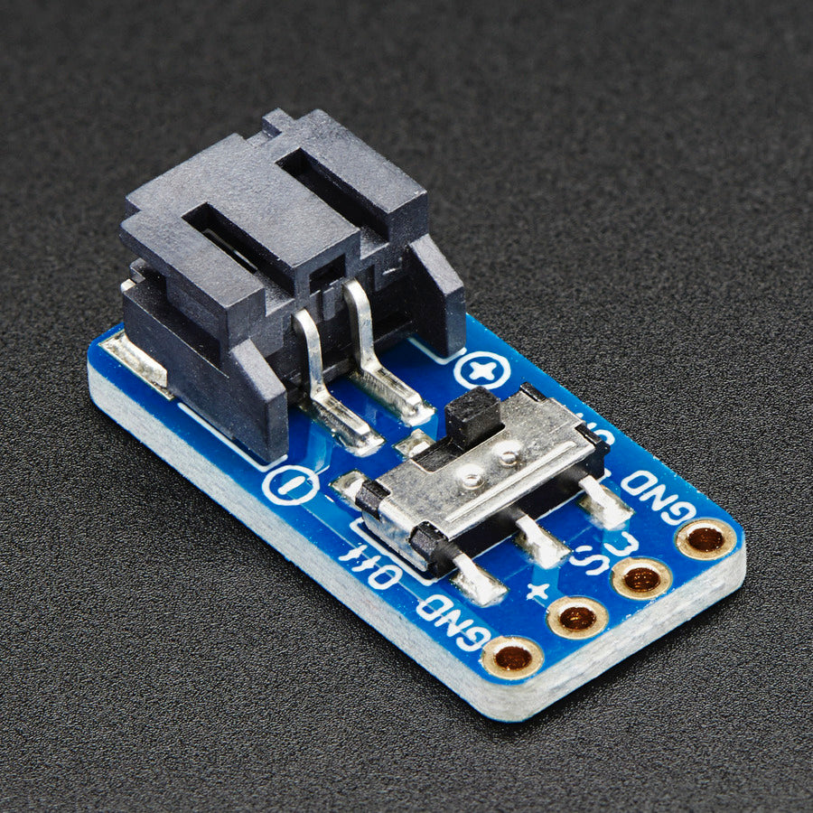 This switched JST connector is the best way to quickly prototype with our LiPoly batteries. We paired a genuine JST connector with a slide switch that can do up to 600mA. Both are soldered onto a breadboard-friendly breakout. There's two ground pins, one 'switched' power pin, and one pin that is always on. This is compatible with the "JST PH 2-pin" connectors we use in our battery packs.. Mates perfectly with all 1-cell LiPoly and LiIon batteries from Adafruit as well as our 6V coin cell holder and 3xAAA battery pack. We also have simple JST pigtails that mate with this connector.