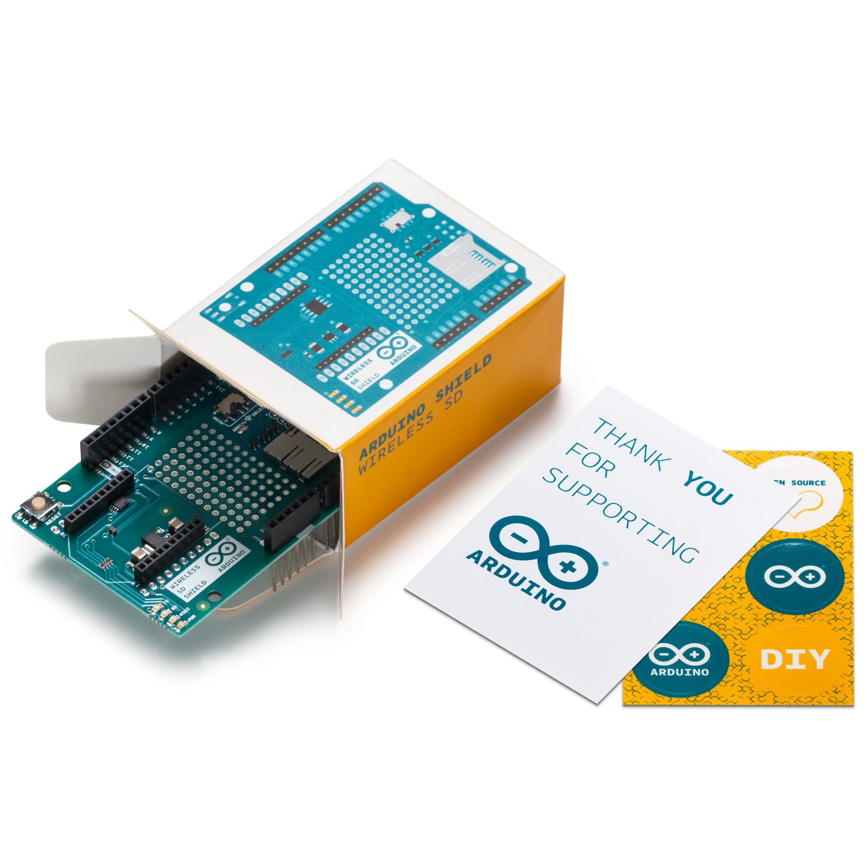 The Wireless SD shield allows an Arduino board to communicate wirelessly using a wireless module. It is based on the Xbee modules from Digi, but can use any module with the same footprint. The module can communicate up to 100 feet indoors or 300 feet outdoors (with line-of-sight). It can be used as a serial/usb replacement or you can put it into a command mode and configure it for a variety of broadcast and mesh networking options. The shields breaks out each of the Xbee's pins to a through-hole solder pad.