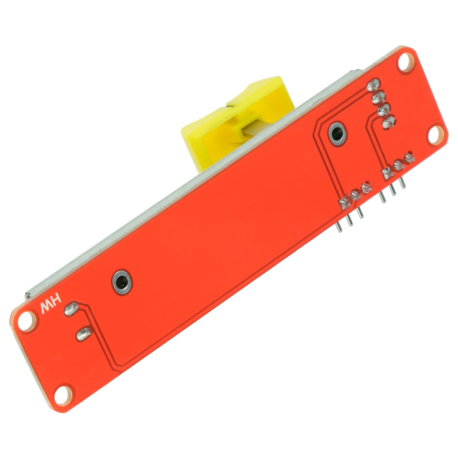 The 10kΩ potentiometer is equipped with a fader knob and has 2 connectors with 3 pins each. Both pin headers offer VCC, GND and an analog output.