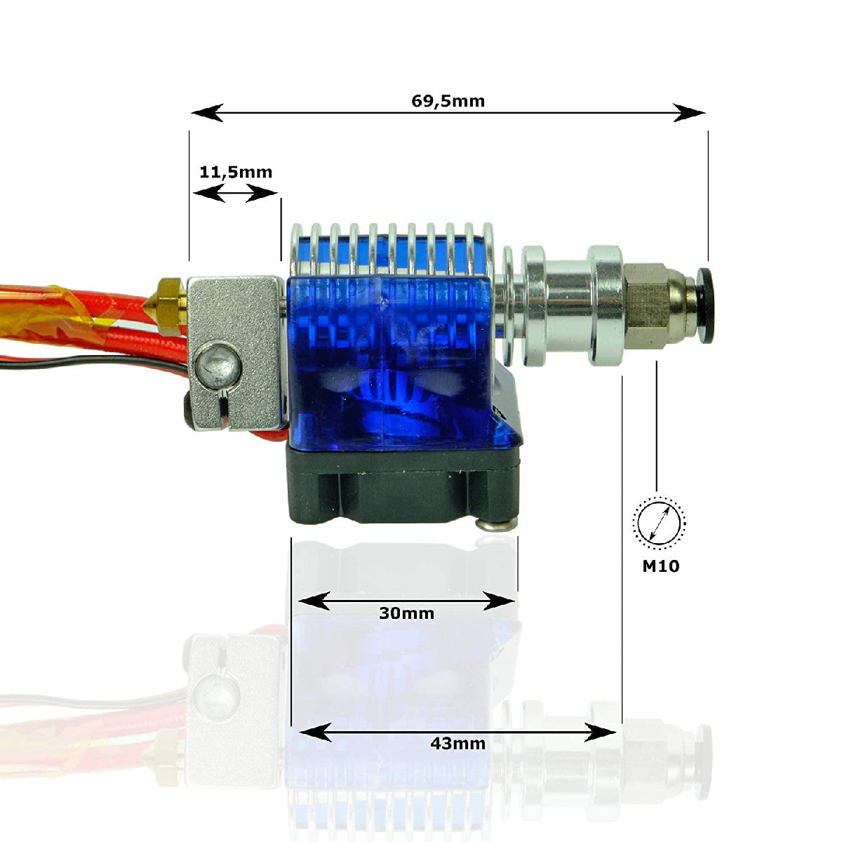 - TECHNISCHE DETAILS - Düsendurchmesser 0.4 mm; 100K Thermistor NTC B 3950; 1 m teflon Schlauch; Lüfter 30*30mm 12V; Kabellängen: Heizpatrone und Thermistor 1m, Lüfter 27cm; Imbus zum wechseln des Heizelements und Thermistors.