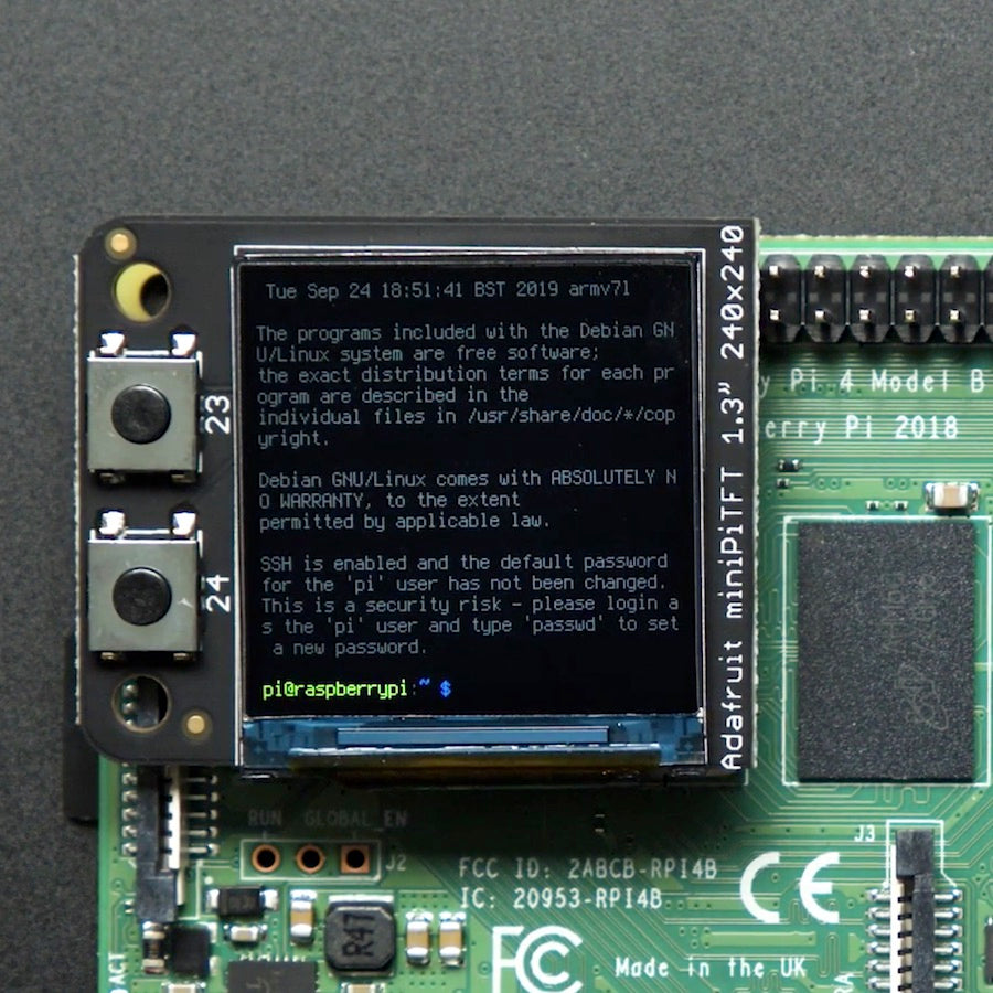 Das Display wird vollständig aufgebaut und getestet ausgeliefert und lässt sich direkt auf das Raspberry Pi stecken. Bei dem verbauten Display handelt es sich um ein IPS Panel, das sich von allen Blickwinkeln gut ablesen lässt und einen hohen Kontrast aufweist. Die Ansteuerung des Displays erfolgt über die SPI-Schnittstelle. Mit der von Adafruit zur Verfügung gestellten Python ST7789 Bibliothek sind Frameraten von etwa 15 FPS möglich. D.h., es können auch einfache Videos und Animationen abgespielt werden.