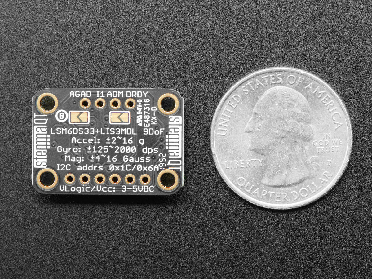 Dieses Adafruit Sensor Breakout Board verfügt über zwei Sensorchipsätze von ST. Der ST LSM6DS33 integriert 3-Achsen-Beschleunigungssensor und -Gyroskop in einem Chip, der ST LIS3MDL liefert räumliche Magnetfelddaten. Kombiniert man die 9-DoF Messdaten lässt sich neben Neigungen, Bewegungen und Rotationen auch die Ausrichtung des Boards im Raum feststellen - ideal um z.B. Motion Tracker umzusetzen.