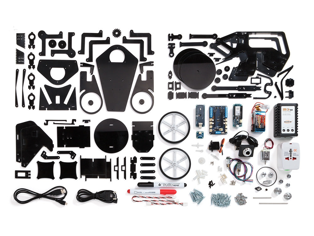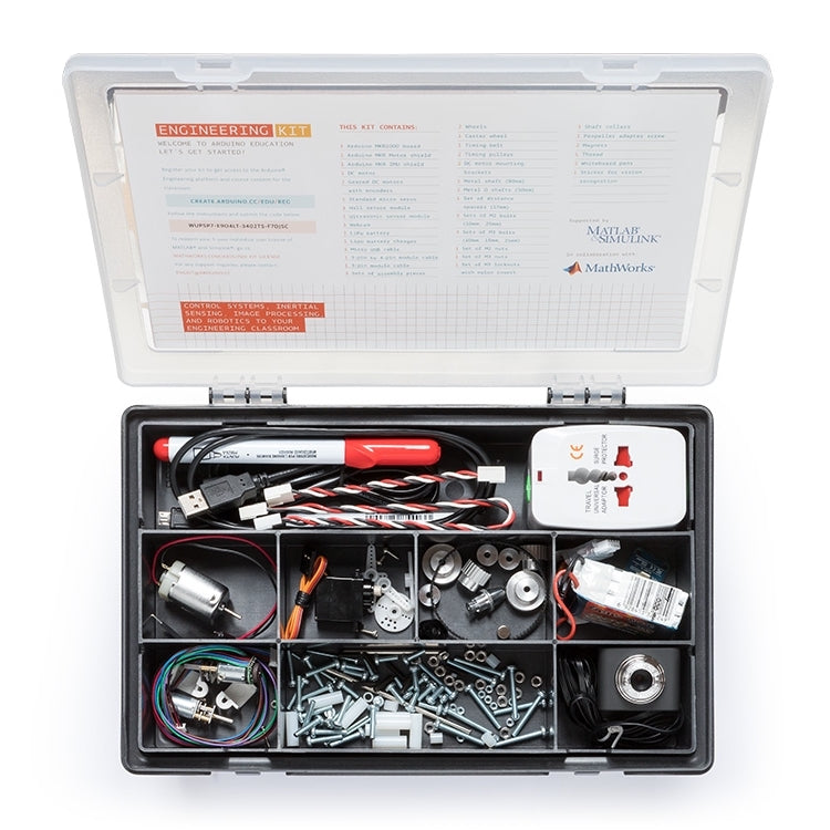 Der Bausatz wird in einer stabilen, stapelbaren Sortierbox geliefert und kann mehrfach wiederverwendet werden. Das Herzstück des Sets bildet ein Arduino MKR1000 Board und viele Bauteile, die speziell für dieses Set entwickelt wurden. Alle elektronischen und mechanischen Komponenten zur Umsetzung der drei genannten Projekte sind enthalten. Weitere Inhalte und Informationen sind online bei Arduino erhältlich. Außerdem ist eine individuelle Ein-Jahres-Lizenz für MATLAB und Simulink enthalten.