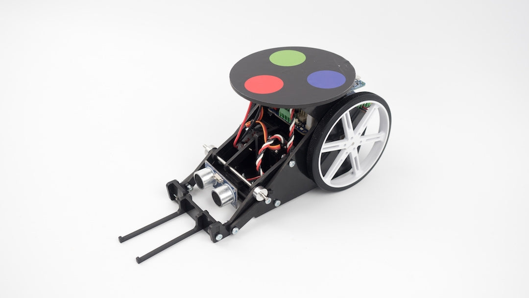 Setzen Sie ein Vehikel zusammen, das zwischen verschiedenen Referenzpunkte navigieren kann und Objekte mithilfe einer Gabel anheben kann. -