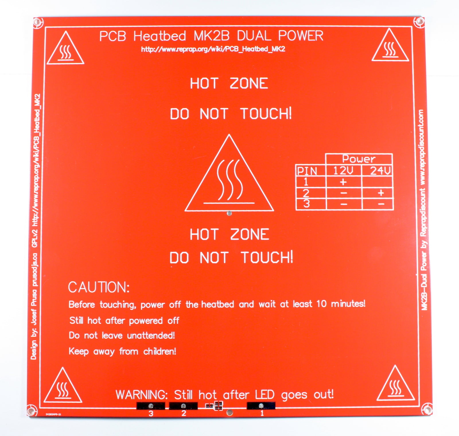 Das Platinenheizbett MK2B Dual Power eignet sich hervorragend für die Verwendung mit RAMPS und lässt sich mit einer Spannung von wahlweise 12 V oder 24 V betreiben.